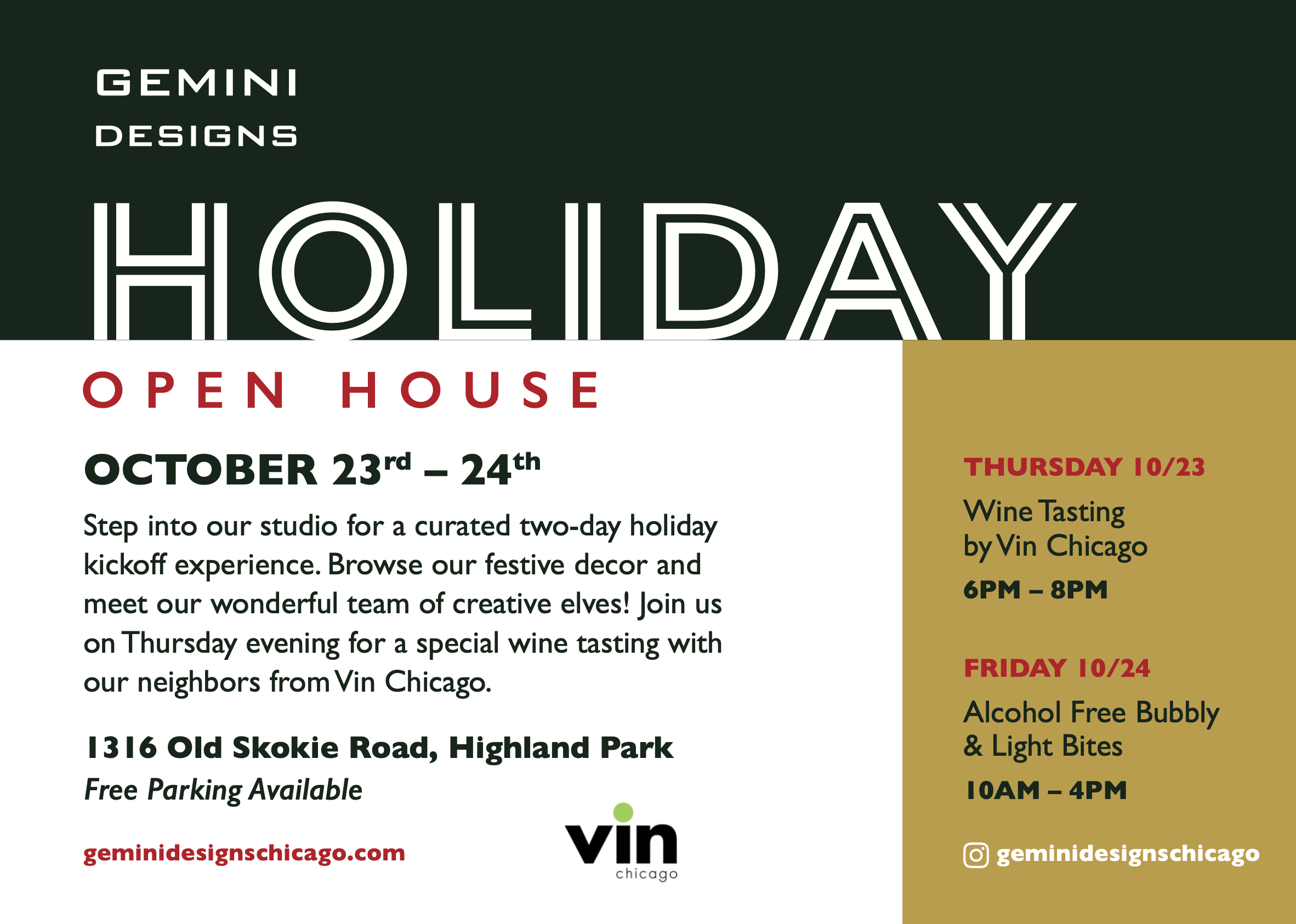 Save the Date: Holiday Open House October 23 (6pm-8pm) and October 24 (10am-4pm). 1316 Old Skokie Rd Highland Park